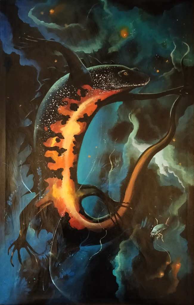 This 50cm by 79cm acrylic painting on reclaimed canvas by artist Iain Kane features a majestic and cosmic interpretation of a great crested newt, depicted in a dreamlike underwater—or perhaps otherworldly—realm. The creature curves sinuously across the canvas, its vivid orange belly glowing like fire against the cooler, inky blues and greens of the background. Dappled with white speckles and rich black markings, the newt’s body suggests a living constellation, as if it swims not through water, but through the cosmos itself.